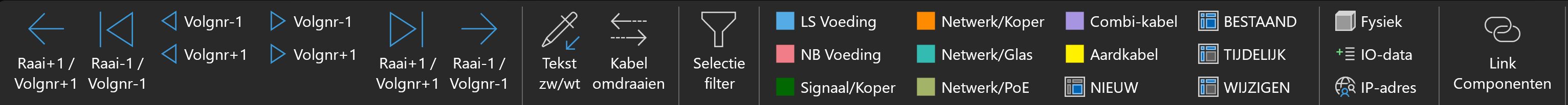 De lijnen tussen de blokken geven de betreffende kabels weer, inclusief kabelnummer (zoals bij het UO bepaald of gegenereerd); de kleur van de kabel geeft het type kabel aan.